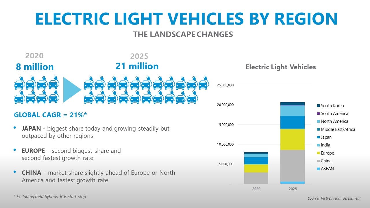 Die Welle neuer Produkte, die dem Wunsch der Verbraucher und der Gesetzgeber nach Reisen mit geringerem CO2-Fußabdruck gerecht werden sollen, rollt schnell an.1 Die Welle neuer Produkte, die dem Wunsch der Verbraucher und der Gesetzgeber nach Reisen mit geringerem CO2-Fußabdruck gerecht werden sollen, rollt schnell an.1 Mobilere und umweltbewusstere Kunden in Kombination mit dem Einfluss staatlicher Regulatoren haben die Dynamik des Transportmarkts verändert. Das Ergebnis ist eine Welle von OEM-Fahrzeugeinführungen bei E-Bikes2, E-Scootern3, Elektrobussen4, eVTOL5, Plug-in-Hybrid-Elektrofahrzeugen (PHEV) und batteriebetriebenen Elektrofahrzeugen (BEV)6. Allein bei den Elektrofahrrädern wird ein Wachstum von über 6 % CAGR erwartet, wobei das größte Wachstum in Asien zu verzeichnen ist. Andere E-Mobilitätslösungen, die mit UBER vergleichbar sind, wie z. B. die Revel-Elektromopeds7, verzeichnen einen Nachfragezuwachs und kommen schneller als erwartet in die Städte. Es wird erwartet, dass BEVs und PHEVs bis 2025 mit einer jährlichen Steigerungsrate von über 21 % wachsen werden. Das bedeutet eine Verdopplung der Zahl der Fahrzeuge alle 3,5 Jahre, und wir können davon ausgehen, dass bald mehr und mehr Elektroautos auf den Straßen unterwegs sein werden!8-10