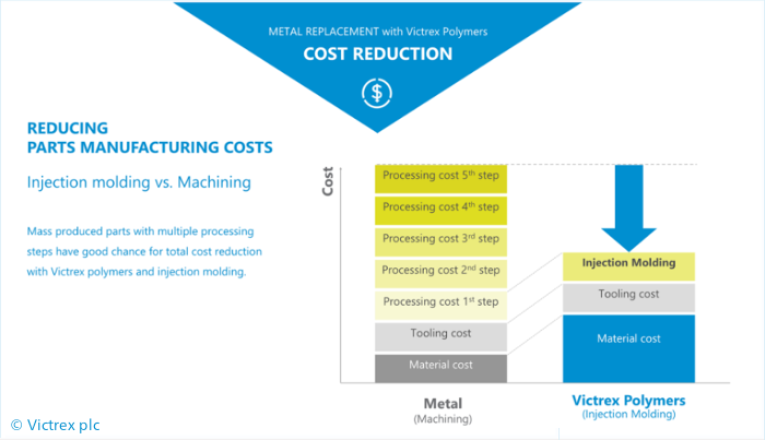 Cost savings: While metal may be lower in raw material cost, the manufacturing process can be time consuming and complex and often requires multiple processing stages. Using HPP such as VICTREX PEEK allows a one-step injection moulding process, resulting in lower component cost but also positively impacting energy and labour cost and reducing the amount of scrap.