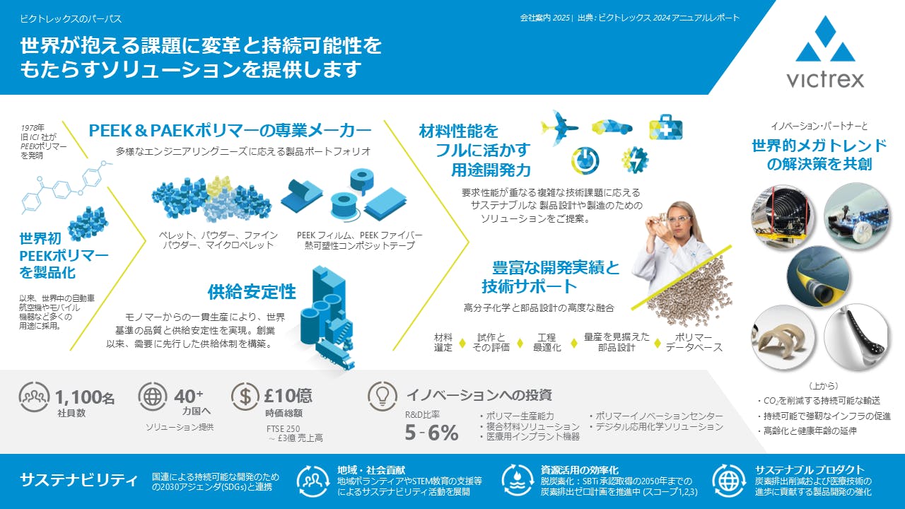 ビクトレックスは世界で唯一、40年以上に渡ってPEEKおよびPAEKポリマーの開発と製造を続けている専業メーカー。ナンバーワンのPEEKエキスパートとして、PEEKについては他社には真似できない豊富な知見やノウハウに裏付けられた開発サポートをご提供します。製造分野のあらゆるお客様との連携をとおして、コンセプトから商品化まで部品開発のあらゆる段階をサポートしています。前例のない新規用途の開発も多くあり、新しいバリュー・チェーンと市場創出もサポートします。